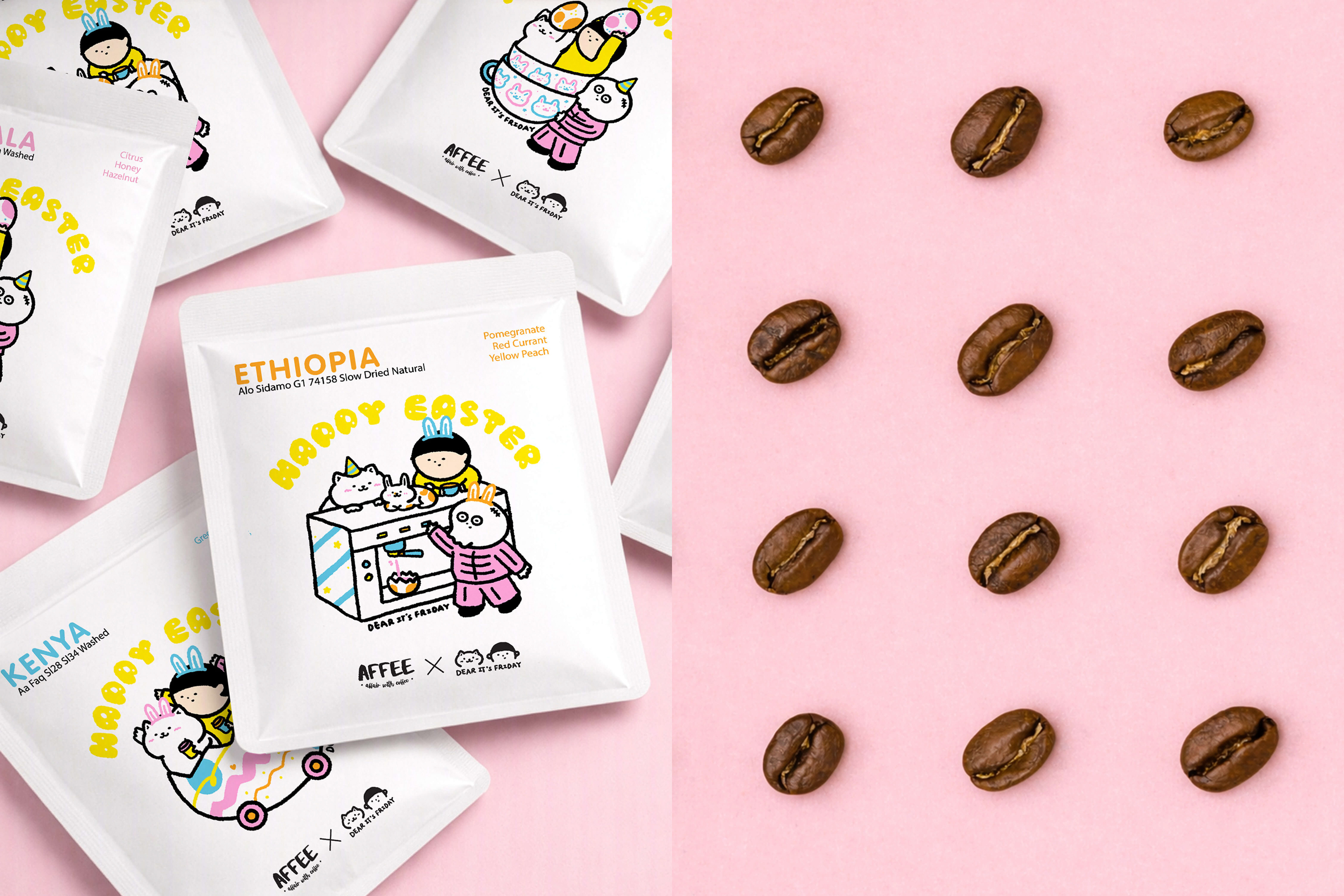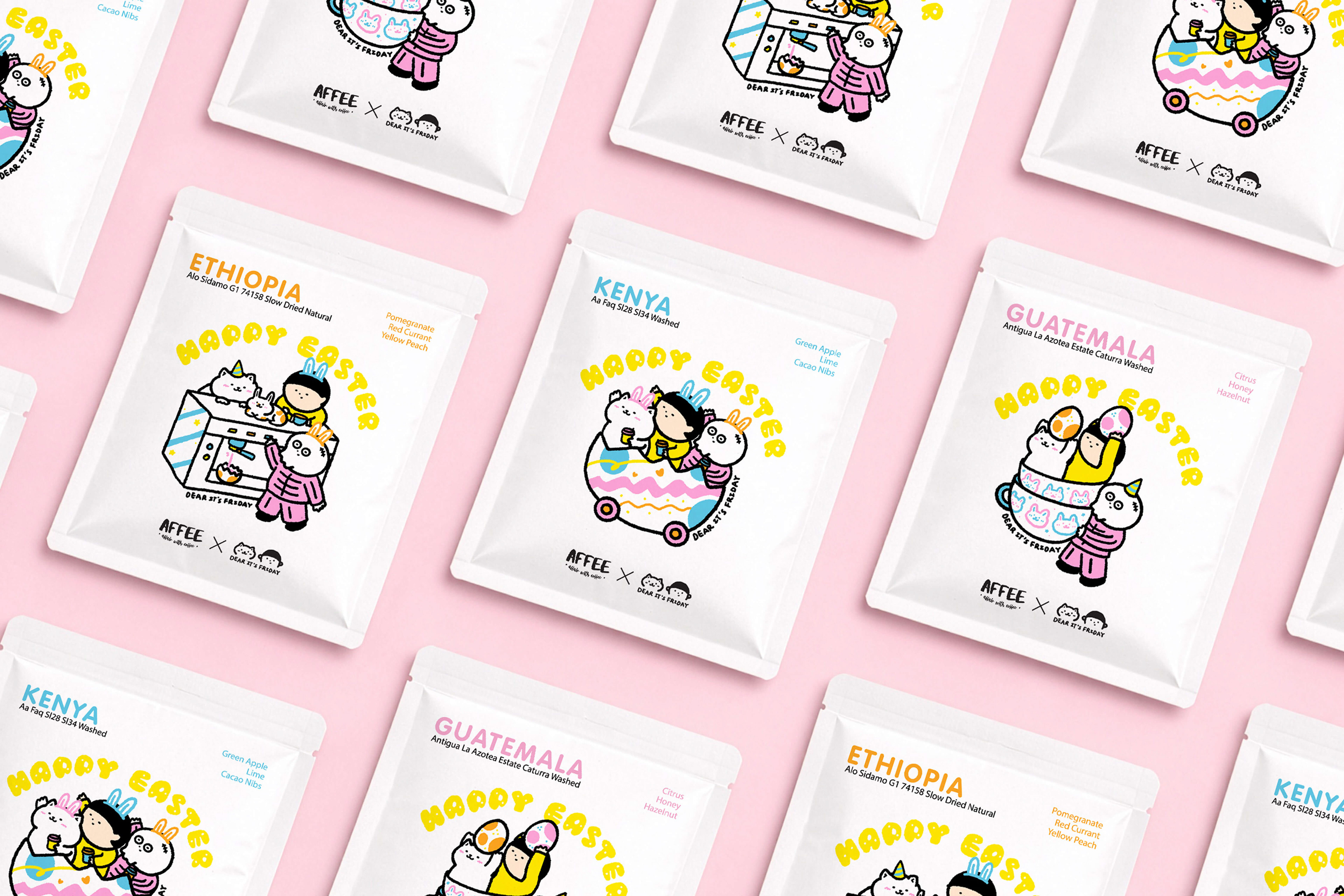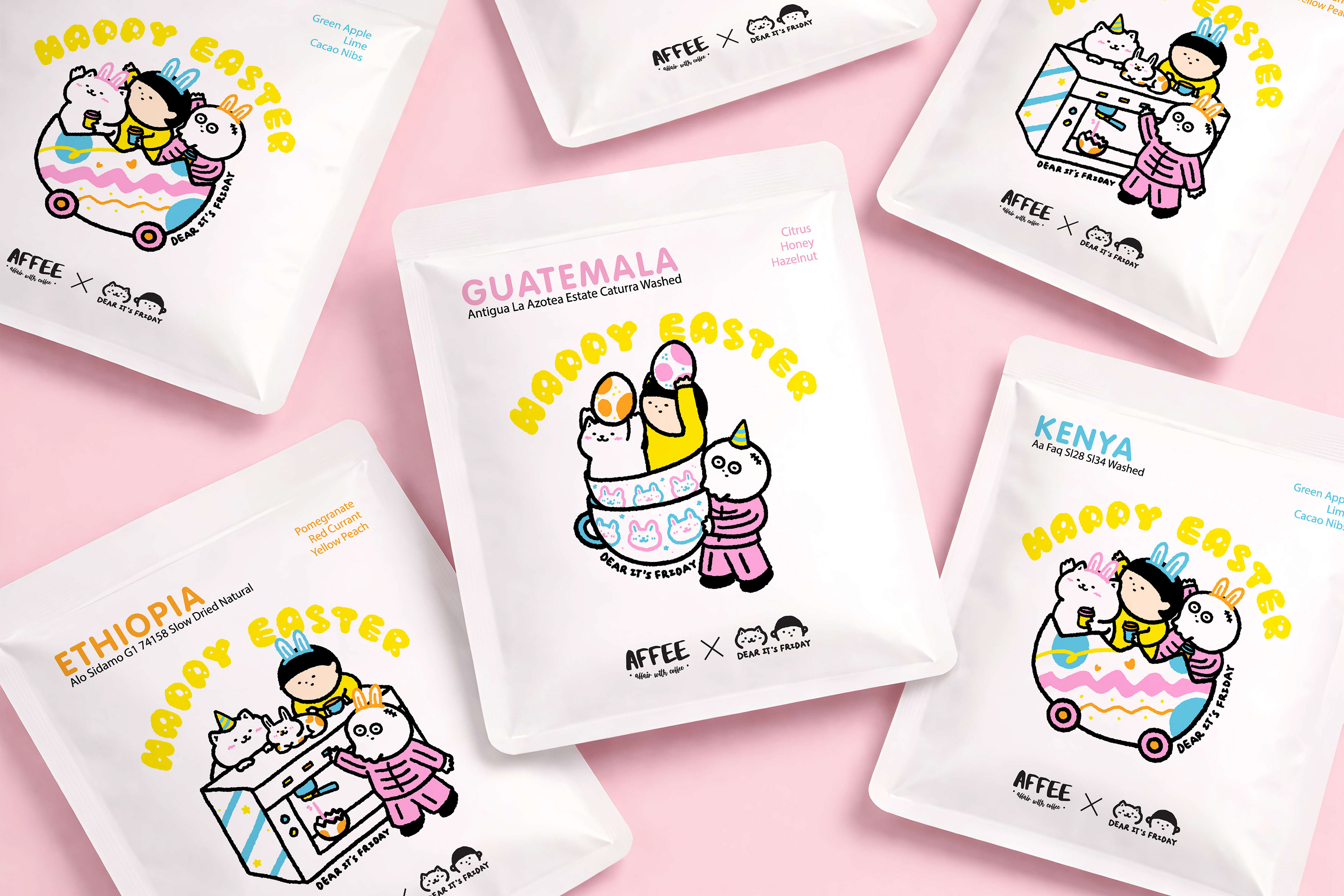 This drip bag collaboration with Affee Coffee started from a simple idea, making coffee packaging a bit more fun and engaging. I created an Easter series with a set of illustrations, each paired with a different coffee bean, so the designs work together as a collection rather than standalone pieces.