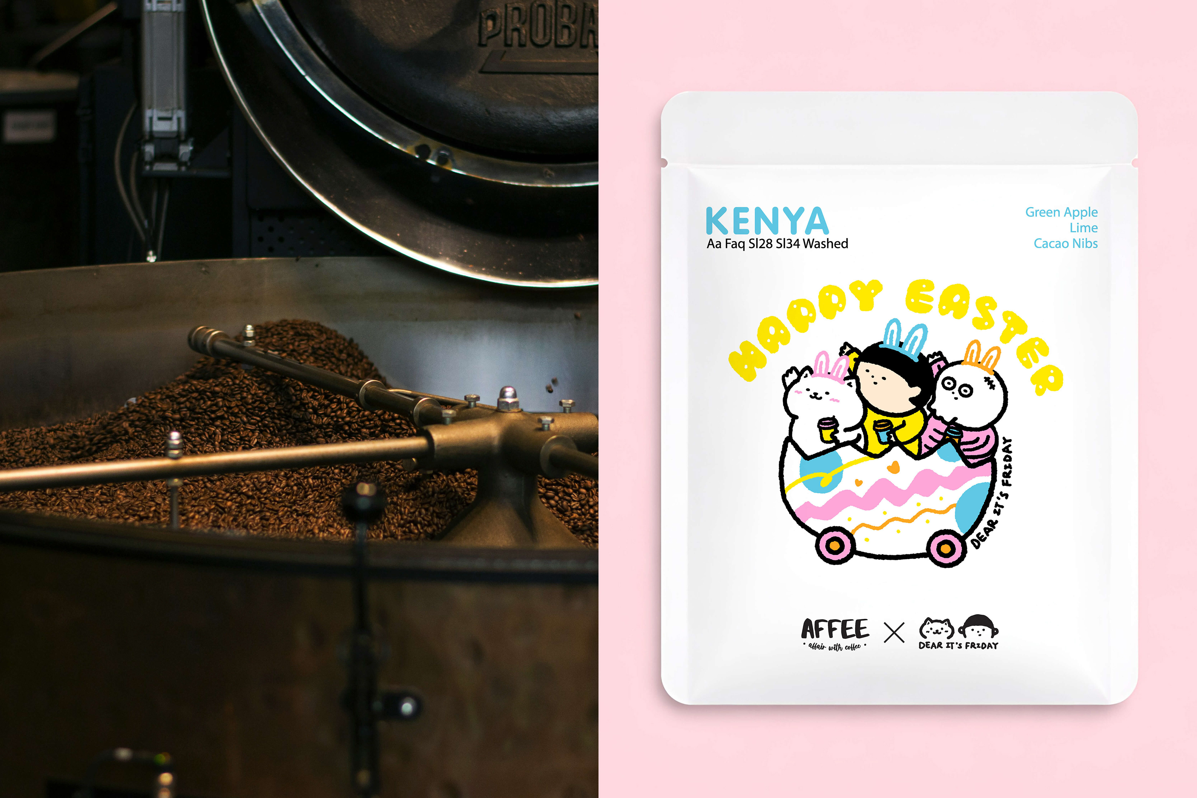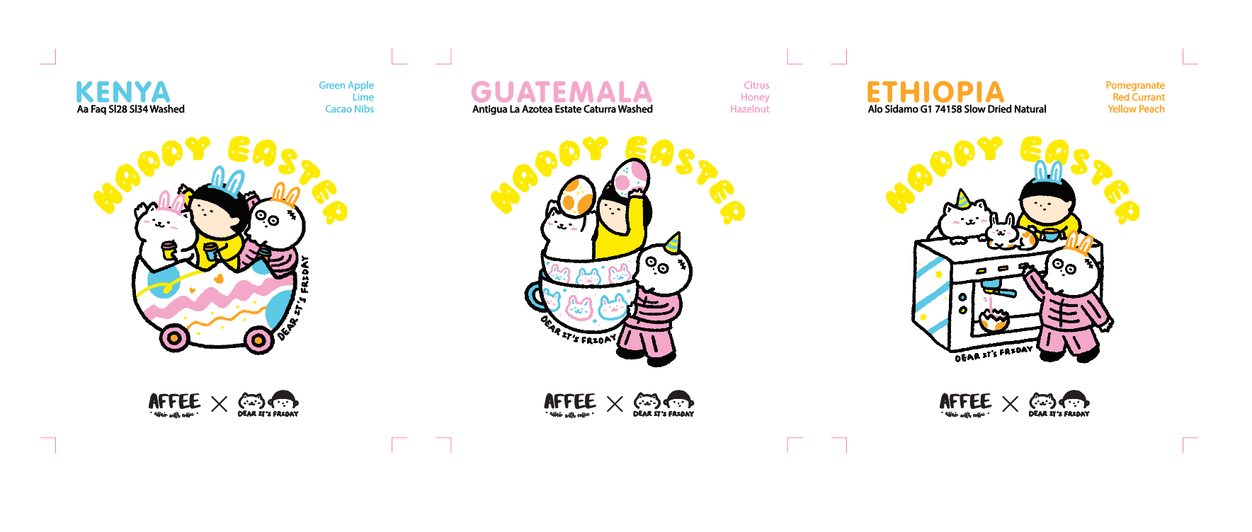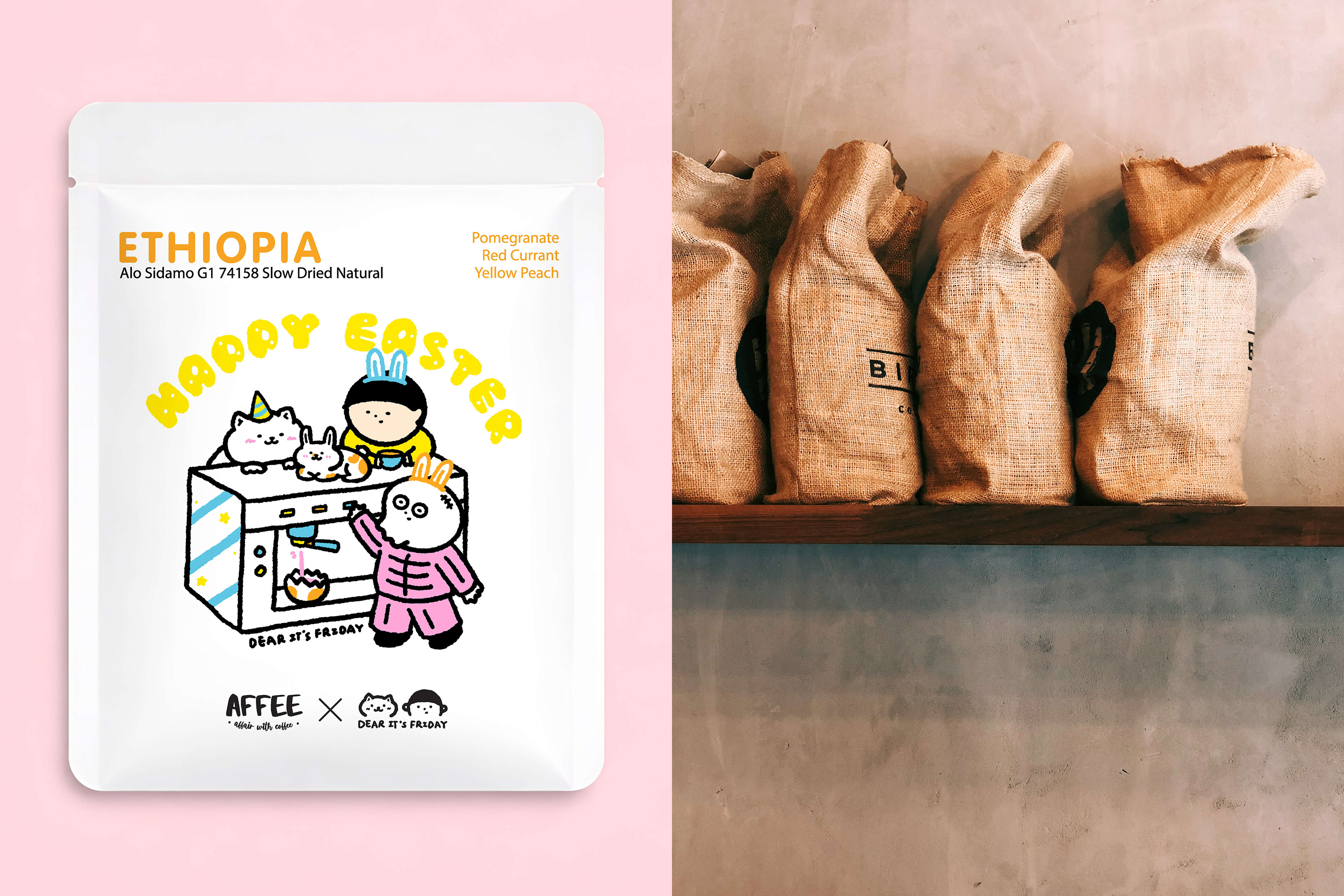 This drip bag collaboration with Affee Coffee started from a simple idea, making coffee packaging a bit more fun and engaging. I created an Easter series with a set of illustrations, each paired with a different coffee bean, so the designs work together as a collection rather than standalone pieces.